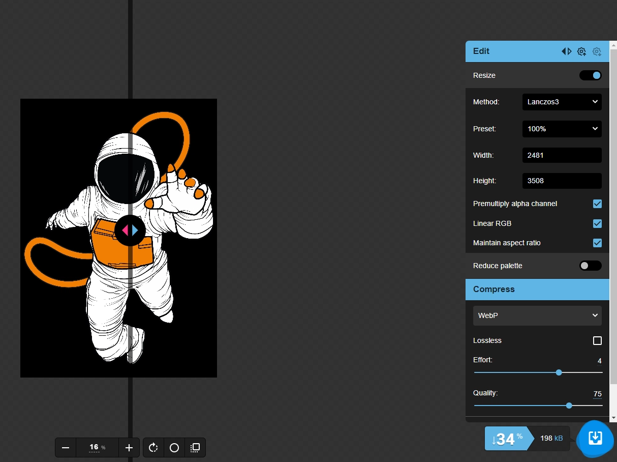 Pour traiter des images qui iront sur un site web, nous vous conseillons d’opter pour le format Webp qui est une bonne alternative pour le référencement de votre site. Là, deux curseurs sont à votre disposition : “Effort” et “Quality”. Nous vous recommandons de laisser la valeur de l’effort tel quel et de jouer sur le niveau de qualité souhaité.