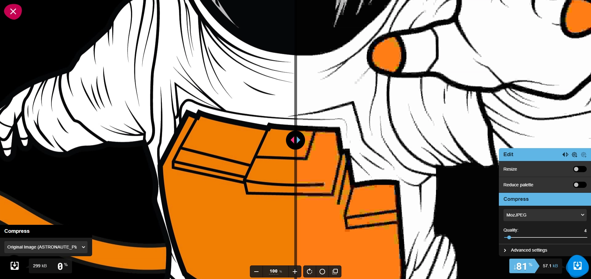 Ce curseur va vous permettre de conserver un bon équilibre entre compression et qualité de l’image. Pour contrôler cela, Squoosh est très bien pensé. L’écran est divisé en deux pour vous permettre de comparer le rendu de l’image après traitement. Ainsi le côté gauche de l’écran vous montre le visuel initial et le côté droit vous montre le résultat obtenu.