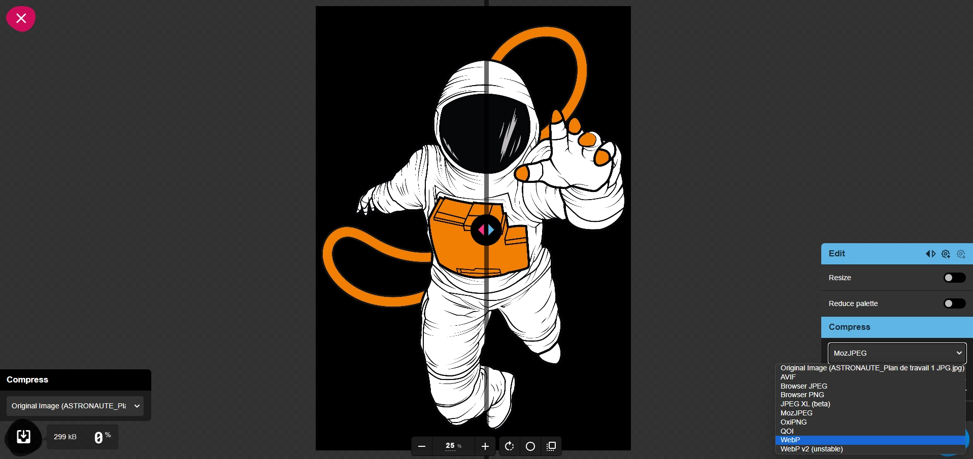 Ensuite, dans la partie “Compress” vous avez un bouton avec menu déroulant qui s’appelle “MozJPEG”, en cliquant dessus vous aurez la possibilité de choisir un autre format. Cela n’est pas exhaustif et vous n’aurez donc pas un grand choix de format. Il faut surtout avoir en tête que cet outil est pensé pour une utilisation digitale des visuels, vous aurez donc des choix adaptés au web à disposition.